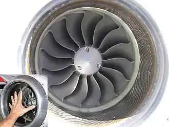 ![]() Toma de aire de un motor PW610F. En la esquina inferior izquierda se puede ver la comparativa con una mano humana. | ||