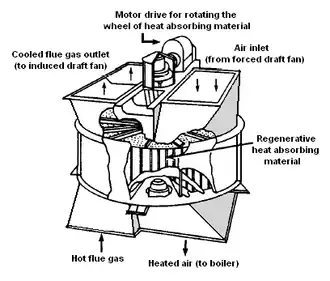 Hay dos tipos de calentadores de aire para su uso en generadores de vapor en centrales de energía térmica: uno es un tipo cromático construido en el conducto de gas de calderas, y el otro es un precalentador de aire regenerativo. Estos pueden estar así dispuestos para que el gas circule en las corrientes de gas horizontal o verticalmente en todo el eje de rotación.