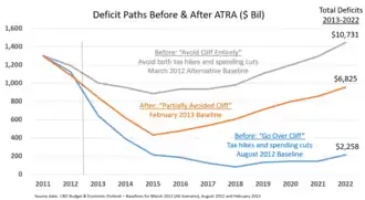 - ↑ Staff (November 8, 2012). "Economic Effects of Policies Contributing to Fiscal Tightening in 2013". Congressional Budget Office. Retrieved February 25, 2013.