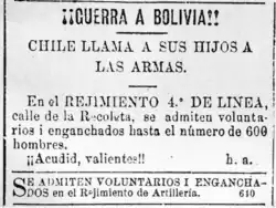 Gonzalo Bulnes acusa que, después de la ocupación de Antofagasta, tanto la prensa chilena como la peruana eran igualmente ardientes: La prensa [peruana] llenaba sus columnas con una literatura guerrera, i su actitud se enardecía con el tono no menos ardiente de la de Chile, especialmente de la de Valparaíso.[2]: 144