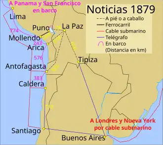 La Paz, capital de Bolivia, no estaba conectada por telégrafo al resto del mundo. Las noticias que llegaban a Tacna, Arica o Antofagasta con destino a La Paz debían ser llevadas a pie o a lomo de caballo.[19]: 230 Desde Tacna o Arica demoraba unos seis días, desde Antofagasta, Cobija o Tocopilla el viaje demoraba catorce días. Existía la alternativa de la ruta desde el puerto peruano de Mollendo en el océano Pacífico[notas 2] por ferrocarril hasta Puno, el puerto peruano en el lago Titicaca. Luego por lancha hasta Chichilaya[notas 2] en Bolivia para continuar a pie o a caballo hasta La Paz. Tenía la ventaja de solo 76 km a pie o a caballo pero dependía del horario de tren y lancha. En Bolivia solo Tupiza (a 606 kilómetros (377 mi) de La Paz) estaba conectada por telégrafo a Buenos Aires, solo desde el 11 de febrero de 1879.[20]: 101