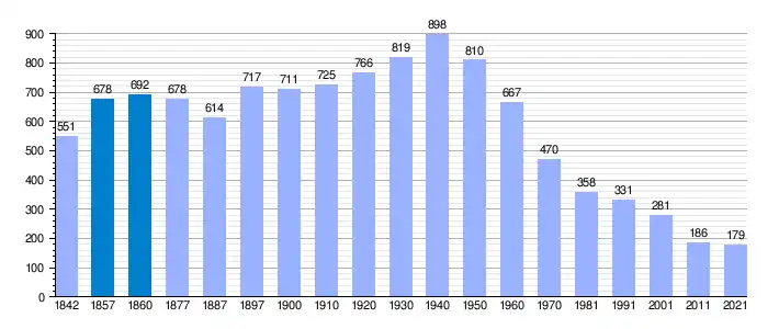 En 1840 el pueblo tiene 180 casas, 138 vecinos y 551 habitantes. La iglesia está servida por cinco curas beneficiados, un organista y un sacristán.