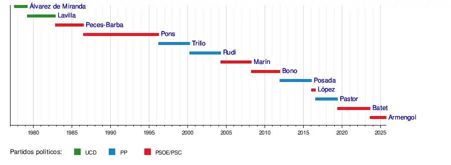 Desde la promulgación de la Constitución española en 1978 ha habido trece presidentes del Congreso de los Diputados diferentes: dos centristas, siete socialistas y cuatro populares. El presidente que más tiempo ha estado en el cargo ha sido Félix Pons (9 años y 8 meses) y el que menos, Patxi López (6 meses).
