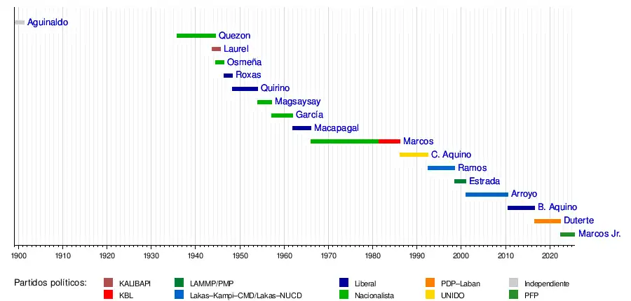 Bongbong MarcosRodrigo DuterteBenigno Aquino IIIGloria Macapagal ArroyoJoseph EstradaFidel V. RamosCorazón AquinoFerdinand MarcosDiosdado MacapagalCarlos P. GarcíaRamón MagsaysayElpidio QuirinoManuel RoxasSergio OsmeñaJosé P. LaurelManuel L. QuezonEmilio Aguinaldo