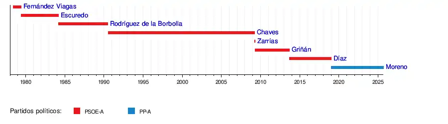 | Presidente de la Junta de Andalucía[7] | Inicio del mandato | Fin del mandato | Duración del mandato | Legislatura | Gobierno | ||||||