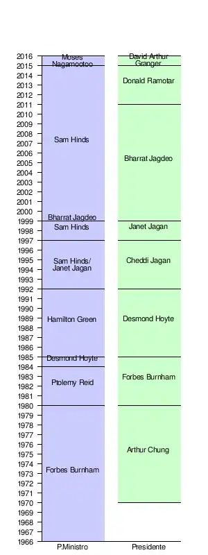Bharrat Jagdeo | 11 de agosto de 1999 | 3 de diciembre de 2011 | PPP | Sam Hinds PPP | ||||