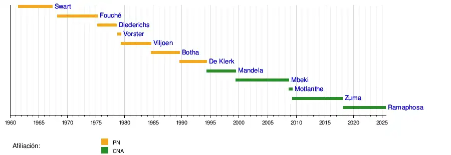 Tras el referéndum de 1960 sobre la República de Sudáfrica y la posterior declaración de la República de Sudáfrica el 31 de mayo de 1961, se creó el cargo de presidente del Estado de Sudáfrica.[3] Originalmente era un puesto ceremonial, pero se convirtió en un puesto ejecutivo en 1984, cuando la nueva Constitución sudafricana de 1983 abolió el cargo de primer ministro y transfirió sus poderes al presidente del Estado. El país puso fin al gobierno minoritario en 1994. El cargo de presidente y las funciones que lo acompañan fueron establecidos por el capítulo cinco de la Constitución de Sudáfrica.[4]