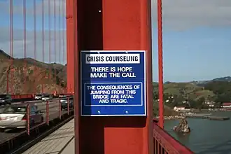 El suicidio es el acto de matarse deliberadamente o, más específicamente, un acto deliberadamente iniciado y realizado por la persona concernida en pleno conocimiento, o con la expectativa, de su fatal desenlace.[18] Al reconocer la necesidad de abordar ampliamente la prevención del suicidio, se han desarrollado varias estrategias apoyadas en evidencias científicas.El abordaje tradicional ha sido identificar los factores de riesgo que incrementan el riesgo de suicidio o autolesión, aunque el metaanálisis de estudios apunta a que la valoración del riesgo de suicidio puede no ser útil y recomienda la inmediata hospitalización de la persona con pensamientos suicidas como la opción más saludable.[19] En 2001 el Departamento de Salud y Servicios Sociales de los Estados Unidos, bajo la dirección del Cirujano General (General Surgeon), publicó la Estrategia Nacional de Prevención del Suicidio, que establecía un marco con esta finalidad en Estados Unidos. Este documento aboga por abordar la prevención del suicidio como una cuestión de salud pública, centrándose en identificar los patrones de suicidio e ideación suicida en grupos de población, en vez de examinar el historial y el estado de salud de individuos aislados.[20] La capacidad de reconocer señales de alarma permite a las personas preocupadas por alguien cercano dirigirlo a los servicios de ayuda.[5]