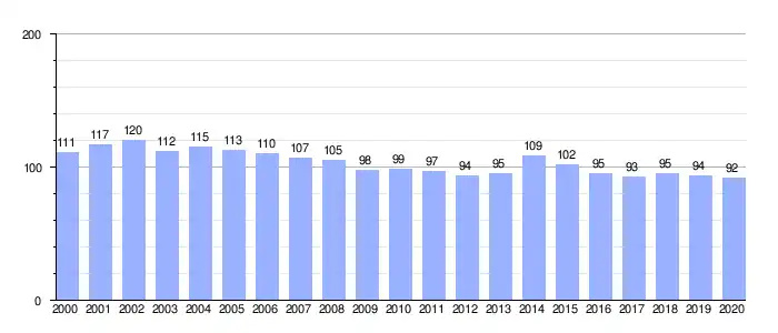 | Gráfica de evolución demográfica de Priesca[2] entre 2000 y 2020 |