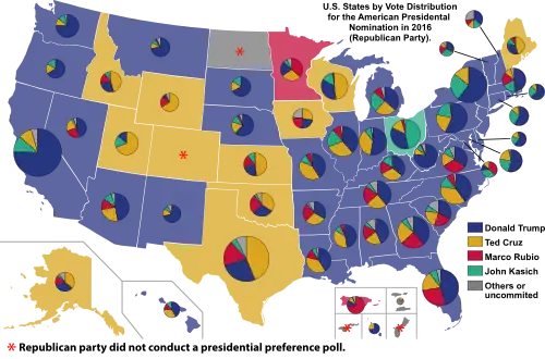 | Estados ganados por Donald Trump Estados ganados por Ted Cruz Estados ganados por Marco Rubio Estados ganados por John Kasich