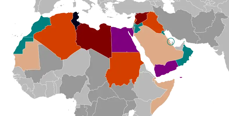 El ejemplo de Túnez fue imitado en el resto del mundo árabe. En Egipto, salieron a manifestarse millones de personas contra Hosni Mubarak quien llevaba 30 años en el poder; los libios contra Muamar Gadafi (42 años en el poder); en Siria contra Bashar Al Assad (15 años entonces); en Yemen contra Ali Abdullah Saleh (21 años entonces); en Argelia contra Abdelaziz Buteflika (12 años entonces). El sultán de Omán Qabus bin Said Al Said y el rey Hamad bin Isa Al Jalifa de Barhéin incrementaron el poder de los parlamentos y prometieron mejores condiciones de vida en ambos países;[3][4][5][6]​ en Jordania fue destituido el primer ministro Samir Rifai.[7]​ Mientras en Egipto Hosni Mubarak fue derrocado el 11 de febrero. En Libia, el gobierno de Gadafi acudió presuntamente al uso de la fuerza aérea para reprimir a los manifestantes y, en respuesta, la OTAN lideró una coalición aérea para frenarlo. Los rebeldes libios, ayudados por la OTAN, expulsaron a Gadafi de Trípoli, la capital, y tomaron el control del gobierno. El 20 de octubre de 2011, Gadafi fue encontrado huyendo y fue ejecutado, dando fin a la primera fase de la guerra. En Yemen, el país más pobre del mundo árabe, las protestas contra Ali Abdullah Saleh duraron más de un año, hasta que en febrero de 2012 fue expulsado del poder. En Siria se produjo otra guerra civil que no se solucionó sino hasta más de 13 años después, con la caída del dictador Bashar Al-Ássad; que a su vez fue el último conflicto en solucionarse. Tan solo, Catar y los EAU fueron los únicos que no tuvieron manifestación alguna, y si la tuvieron, no causó repercusión de ningún tipo.