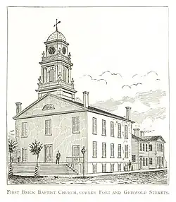 La Primera Iglesia Bautista de Detroit fue fundada el 20 de octubre de 1827.[1] La primera iglesia construida por la congregación, una pequeña estructura de armazón, fue construida en la esquina de las calles Fort y Griswold en 1831.[2] La estructura del marco fue reemplazada por una espaciosa iglesia de ladrillos en 1835. La congregación construyó estructuras más grandes entre 1859 y 1863 y entre 1871 y 1875.