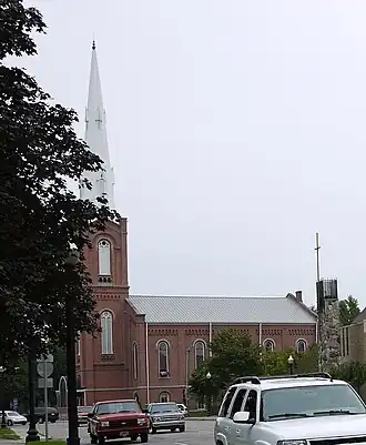 La iglesia fue diseñada en neorrománico y es la iglesia más grande de este tipo en el condado de Branch. El edificio de ladrillo rojo es rectangular con techo a dos aguas y una torre saliente alineada con el centro del edificio. Un marcapiano de arenisca divide el sótano en gran parte sobre el suelo del santuario. El campanario, que mide 56 m de altura, es un hito importante en Coldwater y es uno de los más altos en el sur de Míchigan. Está cubierto con tejas blancas y cuenta con dos juegos de buhardillas angostas también a dos aguas. El campanario alberga una campana fabricada en 1853 por Meneely Bell Foundry de West Troy. En 1868 se instalaron los vitrales multicolor elaborados por la empresa de Chicago George A. Misch and Brothers.[1]
