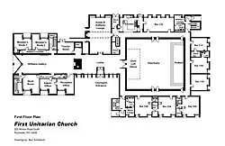 En la adición de 1969, la galería rectangular en el primer piso está diseñada para que pueda usarse como una extensión del vestíbulo o separada en habitaciones más pequeñas por puertas macizas. Las oficinas de la iglesia están ubicadas a ambos lados de la galería. El segundo piso tiene una disposición suelta de espacios que pueden combinarse en una habitación grande o usarse por separado. Los dos pisos principales de la adición tienen chimeneas en el extremo más cercano al santuario y grandes ventanales en el otro extremo que revelan el mundo natural exterior.[5]