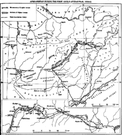 A finales de marzo de 1839, las fuerzas británicas habían cruzado el paso de Bolán, habían llegado a la ciudad de Quetta, en el sur de Afganistán, y habían comenzado su marcha hacia Kabul. Avanzaron a través de un terreno accidentado, a través de desiertos y pasos de montaña de 4000 metros de altura, pero hicieron un buen progreso y finalmente establecieron campamentos en Kandahar el 25 de abril de 1839. Después de llegar a Kandahar, Keane decidió esperar a que las cosechas Maduró antes de reanudar su marcha, por lo que no fue hasta el 27 de junio que el Gran Ejército del Indo volvió a marchar.[28] Keane dejó atrás sus máquinas de asedio en Kandahar, lo que resultó ser un error cuando descubrió que los muros de la fortaleza de Gazni eran mucho más fuertes de lo que esperaba.[28]