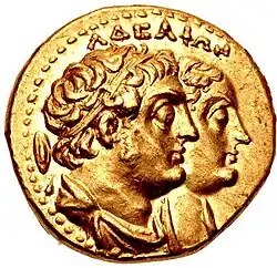 Sin embargo,Grant (1972, p. 30) afirma que el Senado fue informado de su muerte el 1 de agosto de 51 a. C. Michael Grant indica que Ptolomeo XII podría haber estado vivo hasta mayo, mientras que una antigua fuente egipcia afirma que todavía gobernaba con Cleopatra el 15 de julio, aunque en este punto Cleopatra muy probablemente «acalló la muerte de su padre» para poder consolidar su control de Egipto. - ↑ Pfrommer y Towne-Markus (2001, p. 34) escriben lo siguiente sobre el matrimonio entre Ptolomeo II y su hermana Arsínoe II: «Ptolomeo Cerauno, que quería convertirse en rey de Macedonia ... mató a los niños pequeños de Arsínoe delante de ella. Ahora reina sin reino, Arsínoe huyó a Egipto, donde fue recibida por su hermano Ptolomeo II. Sin embargo, no satisfecho con pasar el resto de su vida como invitada en la corte ptolemaica, hizo exiliar a la esposa de Ptolomeo II en el Alto Egipto y ella misma se casó con él alrededor del año 275 a. C. Aunque un matrimonio tan incestuoso fue considerado escandaloso por los griegos, estuvo permitido por la costumbre egipcia. Por esa razón, el matrimonio dividió la opinión pública en dos facciones. El lado fiel celebró a la pareja como un retorno del matrimonio divino de Zeus y Hera, mientras que el otro bando no se contuvo a la hora de emitir su crítica profusa y obscena. Uno de los comentaristas más sarcásticos, un poeta de aguda pluma, tuvo que huir de Alejandría. El desafortunado poeta fue apresado en la costa de Creta por la armada ptolemaica, metido en una canasta de hierro y ahogado. Esto y acciones similares aparentemente desalentaron la crítica cruel.»