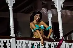 Disney ha ido introduciendo gradualmente nuevas versiones modificadas de los trajes de princesa en los parques y complejos de Walt Disney.[54][104] En septiembre de 2016, el traje de Jasmín recibió un "modesto" cambio de imagen; una versión rediseñada y menos reveladora del traje azul del personaje de la película debutó tanto en Disney World como en Disneylandia después de 24 años.[105] El traje consta de mangas largas, zapatos nuevos, un top de cuerpo entero que oculta la cintura, un escote alto[54] y un peinado modificado, pero conserva el color azul turquesa original de las películas.[105] Sus pantalones se han sustituido por un vestido largo hasta el suelo.[104] También se ha añadido al disfraz un cinturón dorado con un diseño bordado de la cara de Rajah[105] Jasmín presentó su nuevo atuendo a los invitados con una aparición pública en la primera Mickey's Not-So-Scary Halloween Party.[104] Aunque se hicieron modificaciones similares a los disfraces de Pocahontas y Mulan,[106] el rediseño de Jasmín ha inspirado la respuesta más controvertida por parte del público.[104] Cuando se les pregunta, los asistentes del parque y los miembros del reparto explican que los rediseños se han hecho para ser más fieles a las culturas de las que proceden los personajes, aunque Jasmín es del reino ficticio de Agrabah[104] Rachel Paige, de HelloGiggles, señaló que la razón principal de las drásticas modificaciones es que varios visitantes del parque se quejaban de que el personaje dejaba el vientre al descubierto y de sus efectos en las niñas; Paige defendió que el atuendo es acorde con la ubicación y la época en la que está ambientada la película.[105] Se espera que el rediseño aparezca gradualmente también en otros parques temáticos de Disney de todo el mundo.[105] Jasmín, junto con Aladdín, es un personaje que se puede conocer en todos los parques del mundo y normalmente se encuentra en Adventureland.