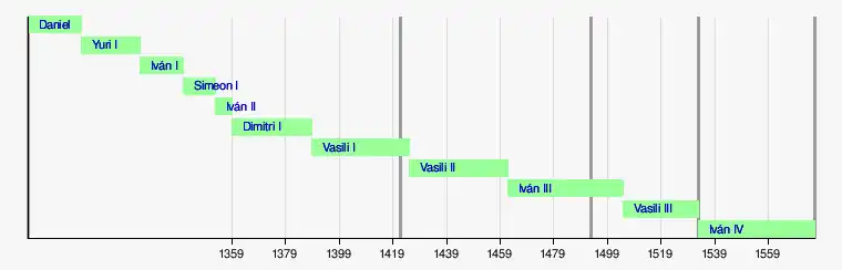 Más importante aún para la formación del estado moscovita, fue el gobierno de príncipes ambiciosos, determinados y afortunados.[7] El primer príncipe moscovita fue Daniil Aleksándrovich (reinado entre 1283 y 1303), que aseguró el principado para su familia, los Rúrikovich. Su hijo, Iván I de Rusia (reinado entre 1316 y 1340), llamado Iván Kalitá (Iván la Bolsa de dinero), obtuvo el título de Gran Príncipe de Vladímir de los líderes mongoles. Cooperó estrechamente con los mongoles, recaudando tributos de otros principados en los que se fragmentó la Rus de Kiev. Esta relación le valió ascendencia regional, particularmente sobre el principal rival de Moscú, el Principado de Tver.