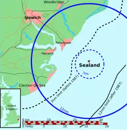 Sealand reclama como su territorio las aguas alrededor de la torre en una extensión de doce millas náuticas y ha afirmado haber defendido físicamente su reclamación al menos en una ocasión. En un incidente en 1990 en el que se le disparó desde Sealand al Golden Eye, un buque auxiliar de la Marina Real.[cita requerida]