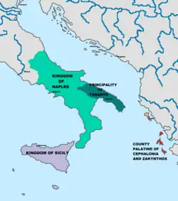 - Esta obra contiene una traducción derivada de «Principality of Taranto» de Wikipedia en inglés, publicada por sus editores bajo la Licencia de documentación libre de GNU y la Licencia Creative Commons Atribución-CompartirIgual 4.0 Internacional.