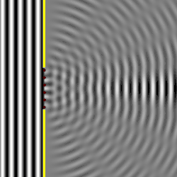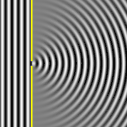 Lo mismo ocurre para la luz al pasar el borde de un obstáculo, pero esto no es fácilmente observable debido a la corta longitud de onda de la luz visible. La interferencia de la luz de áreas con distancias variables del frente de onda móvil explica los máximos y los mínimos observables como franjas de difracción. Ver, por ejemplo, el experimento de la doble rendija.
