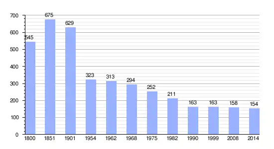 Los datos demográficos contemplados en este gráfico de la comuna de Prinsuéjols[4] se han cogido de 1800 a 1999 de la página francesa EHESS/Cassini, y los demás datos de la página del INSEE.[5]