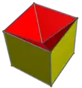 - Un prisma poliédrico es un prisma de 4 dimensiones hecho por dos poliedros trasladados conectados por celdas de prisma de tridimensionales. Un poliedro regular {p, q} puede construir el prisma policórico uniforme, representado por el producto {p, q}×{}. Si el poliedro es un cubo, y los lados son cubos, se convierte en un teseracto: {4, 3}×{} = {4, 3, 3}.