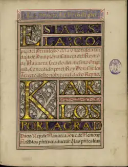 - ↑ La unión et Privilegio. Copia del privilegio de la unión de la ciudad de Pamplona, cabeza del reino de Navarra... [Manuscrito. Consultado el 21 de enero de 2023.