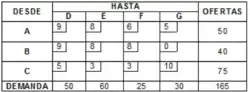 Tabla de transporte: Otra forma de plantear el problema de transporte ( recordemos que el problema de asignación es un caso especial del de transporte) es mediante una tabla llamada tabla de transporte, la cual tiene forma de matriz donde los renglones representan las fuentes y las columnas los destinos o trabajos.