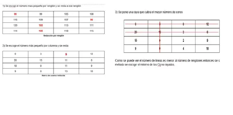 Aquí encontramos al menos un cero en todas las filas, entonces si tenemos más de 1 Cero en una determinada fila se compara quién es el menor y se toma este. Luego se tacha los ceros que podrían existir en las filas y columnas correspondientes al número tomado. Luego comparamos con la matriz original y se toman los números en las que están los ceros no tachados, luego sumamos y encontramos la solución óptima.