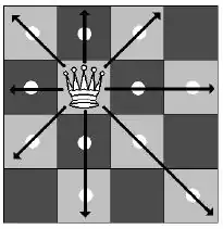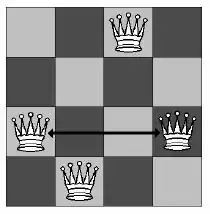 El problema de las filas y columnas lo tenemos resuelto, pero ¿qué ocurre con las diagonales? Para las posiciones sobre una misma diagonal descendente, se cumple que tienen el mismo valor ; mientras que para las posiciones en la misma diagonal ascendente, se cumple que tienen el mismo valor . Así, si tenemos dos reinas colocadas en posiciones y entonces están en la misma diagonal si y solo si cumple: