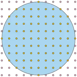 El área de un círculo de radio r viene dada por πr2, y puesto que un cuadrado de área 1 en R2 contiene un punto entero solamente, la respuesta esperada al problema podría ser sobre πr2. De hecho, podría ser ligeramente mayor que eso, puesto que los círculos son más eficientes al encerrar espacios que los cuadrados. Así que, en efecto, se podría esperar que