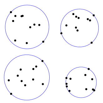 algorithm welzl:[8] input: Finite sets P and R of points in the plane output: Minimal disk enclosing P with R on the boundary, or undefined if no such disk exists if P is empty or |R| ≥ 3: if |R| = 1: (we do this to support multisets with duplicate points) (we assume that a circle with a radius of zero can exist) p := R[0] return circle(p, 0) else if |R| = 2: (we do this to support multisets with duplicate points) (we use that the smallest circle between two points has a center at their midpoint) (and the segment that passes through them is a diameter of the circle) p0 := R[0] p1 := R[1] center := midpoint(p0, p1) diameter := distance(p0, p1) return circle(center, diameter / 2) else if the points of R are cocircular: return the ball they determine else: return undefined choose p in P (randomly and uniformly) D := welzl(P - { p }, R) if p is in D: return D return welzl(P - { p }, R ∪ { p })