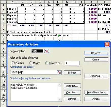 La Figura I es una imagen de la "Hoja de Cálculo" utilizada. La parte superior corresponde al planteamiento del problema para su tratamiento matemático. En el inferior se ha copiado la pantalla propia del "Solver", donde puede apreciarse la estructura típica de esta clase de problemas, formada por: