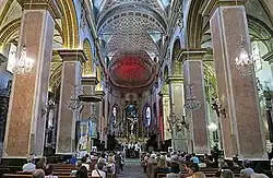 El edificio fue reconstruido entre 1604 y 1625. Las tres naves de la iglesia están ricamente decoradas con oro y mármol en estilo barroco. La fachada occidental fue realizada hacia 1660-1670, presenta una decoración barroca genovesa. Es de dos niveles rematados con tres frontones. Tiene un campanario adosado a la parte sur del ábside, terminado en 1620.