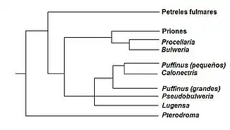 Un diagrama simplificado que muestra las relaciones filogenéticas dentro de la familia Procellariidae. La división de géneros en los petres fulmares y priones no se muestra. Nunn y Stanley (1998) y Bretagnolle et al (1998).