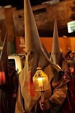 Las cofradías se abren con la Cruz de Guía, que suele ir acompañada de una pareja de nazarenos con faroles. A partir de la cruz de guía comienzo el cortejo de nazarenos que portan faroles. En 2013, había treinta de dichas hermandades[6] que incluía la Cofradía del Virgen del Carmen, la Cofradía del Santo Entierro, Cofradía del Descendimiento, Cofradía del Ecce Homo y la Cofradía de la Soledad, que lleva una imagen de Nuestra Señora de la Soledad.[3][4] Los miembros de las diferentes hermandades se identifican con los colores de sus túnicas, que identifican su parroquia distinguiéndose de una cofradía o hermandad a otra por diversas características, ya sea el color, emblema que identifica a cada grupo y muestran la influencia de las procesiones de Semana Santa de Sevilla. Los cofrades más notables son los nazarenos , que van ataviados con Capirote, antifaz y capa. Entre los mismos nazarenos también existen diferencias, algunos van descalzos haciendo así más dura su penitencia, otros portan cruces, están los que llevan diversos elementos representativos de la hermandad, objetos musicales, cirios, etc.[2][4] Las cofradías participan como una forma de penitencia, con el rostro cubierto y algunos incluso caminan con cadenas atadas a sus tobillos.[2] Las cofradías incluyen a adultos y niños con diversa vestimenta que incluyen monaguillo, soldados romanos, mujeres usando rebozos y portando cirios, toreros, políticos y artistas.[2][4][6][8]
