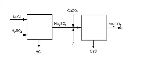 El proceso Leblanc es un proceso discontinuo mediante el cual se somete el cloruro de sodio a una serie de tratamientos, para finalmente producir carbonato de sodio. En la primera etapa, el cloruro de sodio se calienta con ácido sulfúrico para producir sulfato de sodio (llamada torta de sal) y gas cloruro de hidrógeno de acuerdo con la ecuación química