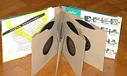 Los métodos de embalaje cambiaron desde la introducción del disco LP. La funda «envolvente» o «abatible» se convirtió inicialmente en el método de embalaje estándar para los LP durante la década de 1950.[10] Con este método, la portada se puede imprimir en color, mientras que la contraportada presenta solo texto en negro sobre un fondo blanco. Estas fundas están construidas en dos partes: una sección frontal laminada se envuelve alrededor de un panel posterior separado. Se utilizan tres «solapas» para unir los paneles frontal y posterior juntos en el exterior. Como la sección de la contraportada de cartón sin laminar es propensa a decolorarse debido a la exposición a la luz natural, en algunos casos una sola hoja impresa que contiene la información de la contraportada se pega sobre todo el panel posterior, cubriendo las solapas «envolventes» pero sin llegar al borde exterior, permitiendo así que algunas de las «solapas» laminadas queden expuestas. Si bien la decoloración aún se produce con este método, a menudo es menos evidente que cuando se expone la cubierta trasera de cartón sola. Una característica común de las fundas abatibles en la década de 1960 era que la información específica de las versiones monoaural o estéreo del disco (por lo general, un número de catálogo específico del formato y las palabras «MONO» o «ESTÉREO») se imprimían en la misma portada, y todo el panel frontal se desplazaba hacia arriba o hacia abajo[11] para exponer la «versión» apropiada en la parte frontal, mientras que el panel de la cubierta posterior cubría la que no se usaba (pero a menudo no muy bien).