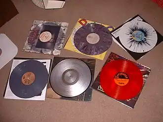 Si bien los discos generalmente se imprimen en vinilo negro liso, el álbum en sí tiene un aspecto mucho más ornamental. Esto puede incluir un color sólido (que no sea negro), decoración con salpicaduras, una apariencia de mármol o transparencia (ya sea incolora o teñida de un color). Algunos ejemplos de esto se pueden ver en la imagen de la derecha. Uno de los ejemplos más conocidos de esta técnica es la impresión en vinilo blanco del White Album de The Beatles.