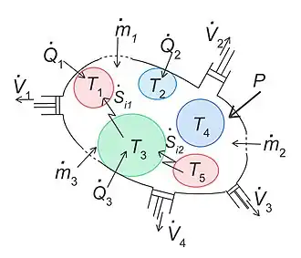 Las leyes de los sistemas termodinámicos aplican a sistemas bien definidos. Fig. 1 es una representación general de un sistema termodinámico. Nosotros consideramos sistemas los cuales, en general, son no homogéneos. El calor y la masa son transferidos a través de las fronteras (no adiabáticas, sistemas abiertos), y las fronteras están moviéndose (usualmente a través de pistones). En nuestra formulación asumimos que la transferencia de calor y masa, y los cambios de volumen toman lugar solo por separado en regiones bien definidas de las fronteras del sistema. La expresión, aquí dada, no es de las formulaciones más generales de la primera y segunda ley. P. ej. la energía cinétca y plazos de energía potencial faltan e intercambio del asunto por difusión está excluido.
