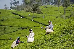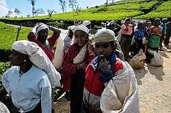 La plantación de té está estructurada en una jerarquía social y las mujeres, que a menudo representan entre el 75% y el 85% de la mano de obra de la industria, se encuentran en los estratos sociales más bajos y son impotentes.[30] Los salarios suelen ser particularmente bajos. En Nuwara Eliya, a las mujeres se les pagaba una sola vez algo tan insignificante como 7 rupias por kilogramo, el equivalente a 4 peniques, o 7 centavos, tienen que recolectar un mínimo de 16 kg de hojas de té cada día y muchas deben completar 16 km al día. Los hombres que trabajan en las plantaciones de té normalmente talan árboles u operan maquinaria y se les paga más por día y terminan el día horas antes.[9] Por lo tanto, el salario mínimo diario medio es de 600 rupias.[9][9]