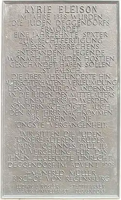 La verdadera razón puede haber sido la eliminación de los pagarés debidos a los judíos.[38] El lugar se convirtió entonces en el destino de una peregrinación, el Deggendorfer Gnad.[39] La iglesia funeraria de Deggendorf, consagrada en 1360, lleva la inscripción: Do bart Gotes Laichenam funden. El llamado "altar judío", un altar conmemorativo que es citado por primera vez en 1604, se encontraba sobre el lugar del presunto sacrilegio de la hostia debajo de la galería del órgano.[40]