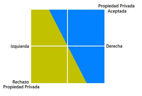 Esquema bidimensional que muestra la aceptación o rechazo de la propiedad privada en el espectro político.