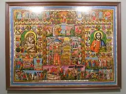 Solían ser iconos de gran tamaño pintados sobre lienzo y vendidos como recuerdo a los peregrinos cristianos ortodoxos a Tierra Santa.[2] Representaban una visión topográfica de los lugares santos cristianos, con la ciudad amurallada de Jerusalén y la iglesia del Santo Sepulcro situadas en el centro.[2] Representaban el género visualmente más atractivo de la floreciente industria local de iconos de finales del período otomano. Los artistas palestinos del siglo XIX dominaban la producción de recuerdos para peregrinos también en Egipto y Siria. Posiblemente creados por primera vez en la segunda mitad del siglo XVII, el ejemplar más antiguo que se conserva entre los varios centenares que han sobrevivido es de 1704. En la primera mitad del siglo XIX, el modelo cambió, sustituyendo la representación topográfica por un mosaico de iconos, todavía centrados en la iglesia del Santo Sepulcro y en la ceremonia del Fuego Sagrado, pero rodeados de escenas de la vida de Cristo y del Himno Acatisto de la Theotokos.[2]