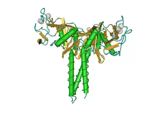 ![]() Estructura cristalizada de la proteína SP-D. Se puede observar los glúcidos en la parte superior, sus monómeros en color verde y algunos iones de calcio como esferas de color gris. | ||||