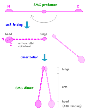 Los dímeros de proteínas SMC constituyen una molécula en forma de V, con dos brazos largos de hélices superenrolladas.[18][19] Para formar esta estructura, un protómero se pliega sobre sí mismo mediante interacciones antiparalelas de las hélices, creado una molécula en forma de varilla. En un extremo de esta molécula, los extremos C- y N-terminal crean un dominio de unión a ATP. El otro extremo es el dominio bisagra. Entonces, dos protómeros se unen en sus respectivos dominios bisagra, creando un dímero en forma de V.[20][21] Los brazos de hélices superenrolladas tienen una longitud de, aproximadamente, 50 nm. Tales hélices superenrolladas antiparalelas son muy raras y solo se encuentran en proteínas SMC (y proteínas relacionadas como Rad50). El dominio de unión a ATP está estructuralmente emparentado con el de los transportadores ABC, una extensa familia de proteínas transmembranas que transportan activamente moléculas pequeñas a través de membranas celulares. Se cree que el ciclo de unión e hidrólisis de ATP modula el ciclo de apertura y cerradura de la molécula en forma de V. Los mecanismos concretos de acción de las proteínas SMC aún están por determinar.