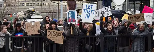 - ↑ a b Anderson, Liz (29 de enero de 2017). «Protesters at Dulles, White House decry Trump refugee ban». WTOP (en inglés). Consultado el 30 de enero de 2017.