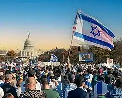 El 25 de noviembre, manifestantes en Jerusalén pidieron la dimisión de Netanyahu.[32] Judíos e israelíes en el extranjero participaron en protestas tanto en apoyo como en protesta por la respuesta israelí a la guerra.[33][34] El 29 de noviembre, la policía arrestó a activistas en una protesta en la Knesset oponiéndose al gobierno.[35] Seis personas fueron arrestadas el 2 de diciembre mientras protestaban frente a la casa de Netanyahu en Cesarea.[36][37] Se informó de un presunto incendio provocado en un campamento de protesta para las familias de los rehenes retenidos en Gaza; las familias sufrieron acoso por parte de los partidarios de Netanyahu.[38][39]