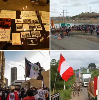 Las protestas en Perú de 2023 correspondieron a una serie de movilizaciones realizadas a partir del 4 de enero de 2023 hasta el 5 de marzo de 2023,[11] tras un período de tregua, de las protestas que se venían dando en el país desde diciembre de 2022 luego del autogolpe de Estado fallido del presidente Pedro Castillo y su posterior destitución y arresto. Estas fueron convocadas por la Coordinadora Macrorregional del Sur[12] —una organización afiliada a la izquierda política conformada por diversos dirigentes de departamentos ubicados al sur del país— en un asamblea realizada el 28 de diciembre de 2022,[13][14] asamblea donde, además, se acordó exigencias de índole política.[15] A esta convocatoria se unieron diversas organizaciones sociales de izquierda y afines.[16][17][18] Estas protestas fueron calificadas, por medios como Infobae y Semana Económica, además del exministro del Interior Rubén Vargas, como la «segunda ola».[19][20][21]